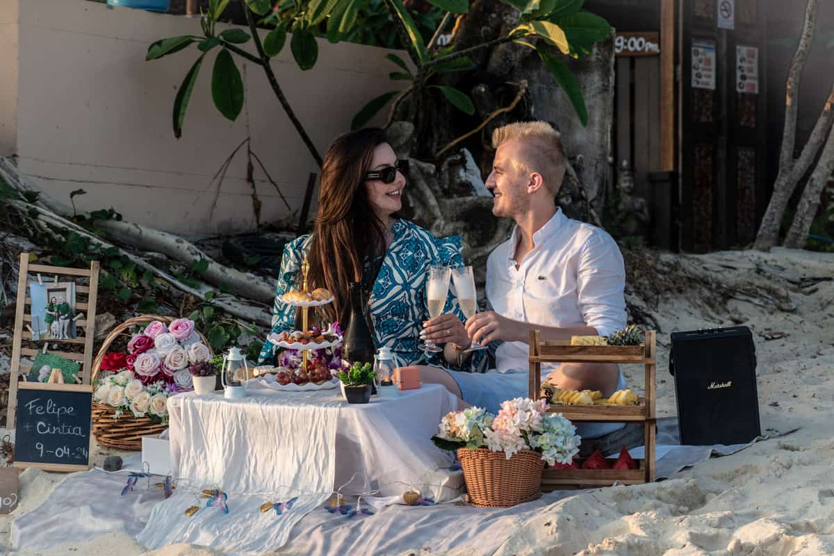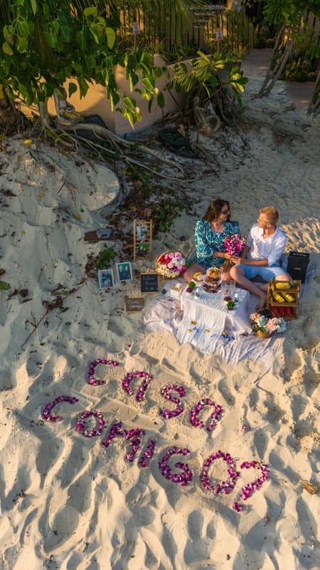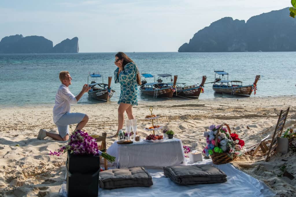 Ele escolheu as águas cristalinas da Tailândia para O Pedido! Iniciamos com um passeio privativo de barco onde ao chegarem em uma praia deserta estava montado uma linda mesa de picnic com o ‘’Casa Comigo’’ escrito em pétalas na areia. Com a presença de um fotógrafo criamos um lindo álbum de memórias deste momento especial.